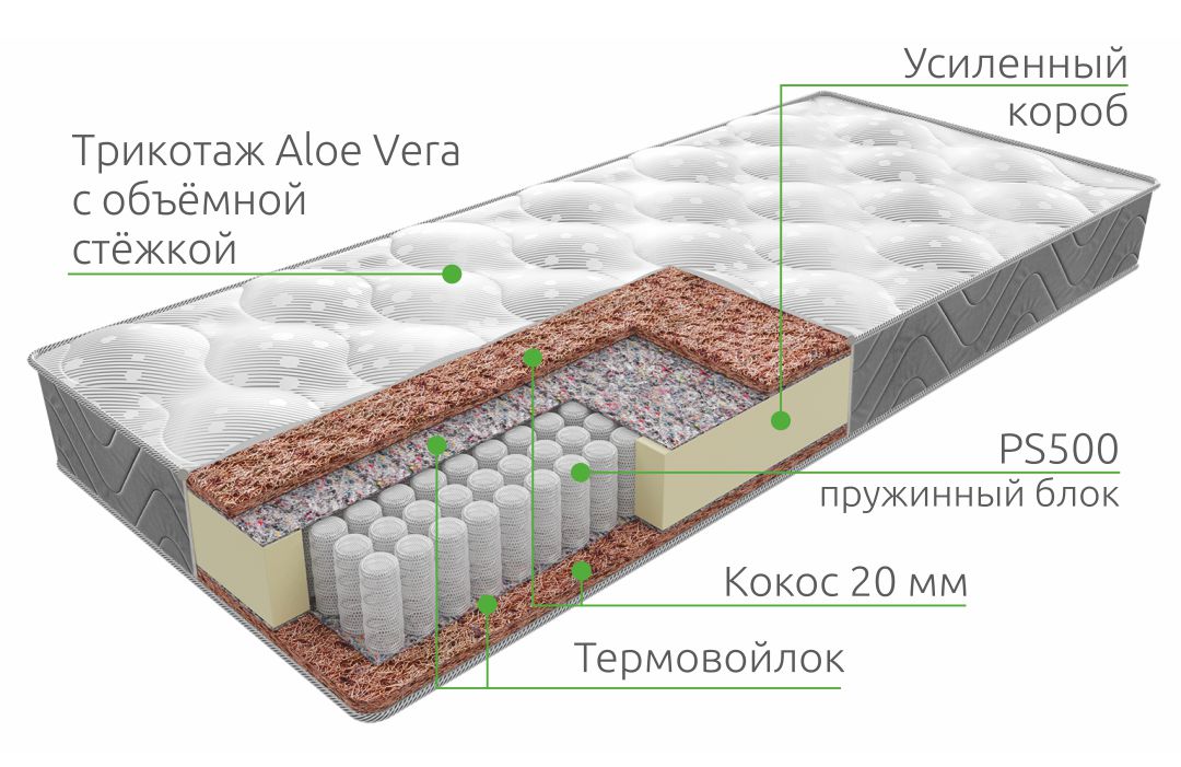 Жёсткость достигается за счёт 2 см плит латексированной кокосовой койры с каждой стороны пружинного матраса Hard 2.